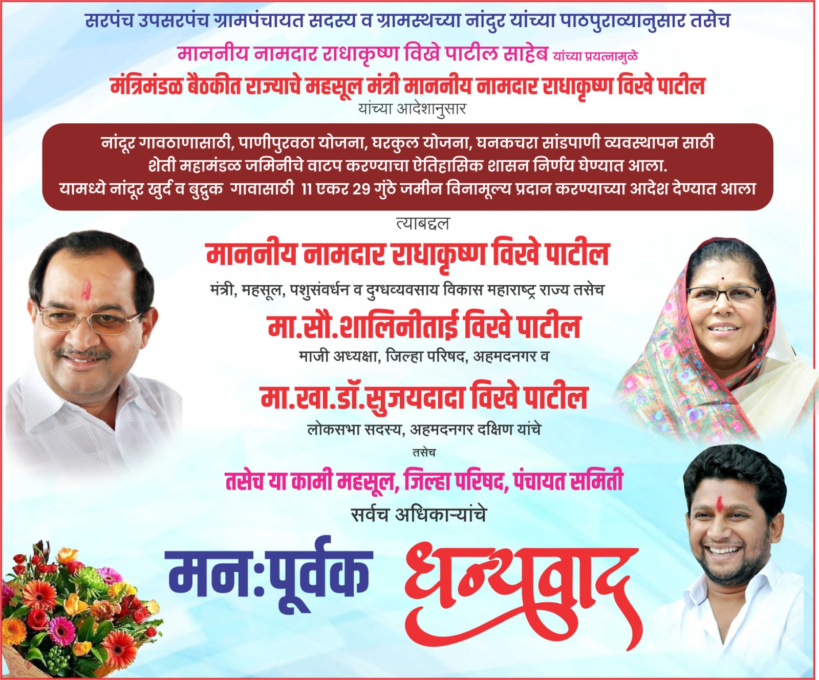 राहाता प्रतिनिधी / विट्ठल ठोंबरे : राहाता तालुक्यातील नांदूर खुर्द व बुद्रुक गावासाठी राज्य मंत्रिमंडळाच्या झालेल्या बैठकीत राज्याचे महसूल मंत्री नामदार राधाकृष्ण विखे पाटील यांच्या आदेशानुसार ऐतिहासिक असा निर्णय घेण्यात आला असून राहाता तालुक्यातील नांदूरमधील गावठाण,पाणीपुरवठा योजना, घरकुल योजना, घनकचरा, नवीन रास्ते,सांडपाणी व विविध योजना व प्रकल्प,व्यवस्थापन साठी शेती महामंडळ जमिनीचे वाटप करण्याचा महत्वपूर्ण शासन निर्णय घेण्यात आला. यामध्ये नांदूर खुर्द व बुद्रुक गावासाठी 11 एकर 29 गुंठे जमीन विनामूल्य प्रदान करण्याच्या आदेश देण्यात आला.असेच अनेक अनमोल सहकार्य आमच्या नांदूर गावासाठी लाभले. माननीय नामदार राधाकृष्ण विखे पाटील साहेब यांच्या सहकार्याने नांदूर ग्रामपंचायत सरपंच,उपसरपंच, ग्रामपंचायत सदस्य व ग्रामस्थ नांदुर यांच्या पाठपुराव्याला यश आले. या निमित्ताने जि.प.अध्यक्षा सौ. शालिनीताई विखे पाटील,लोकप्रिय खासदार सुजयदादा विखे पाटिल यांचे हि खूप खूप धन्यवाद व आभार तसेच या कामी महसूल, जिल्हा परिषद, पंचायत समिती सर्वच अधिकार्यांचे मनःपूर्वक धन्यवाद. शेती महामंडळाची जमीन मिळवण्यासाठी 40 वर्षापासूनचा लढा नांदूर गावच्या सरपंच सौ.प्रीतम विशाल गोरे यांच्या माध्यमातून करत असताना आज मात्र त्यांच्या प्रयत्नांना यश मिळाले आहे.