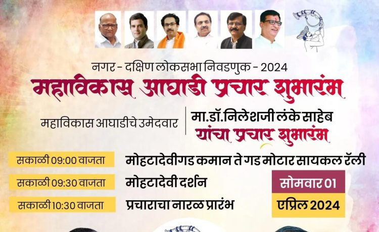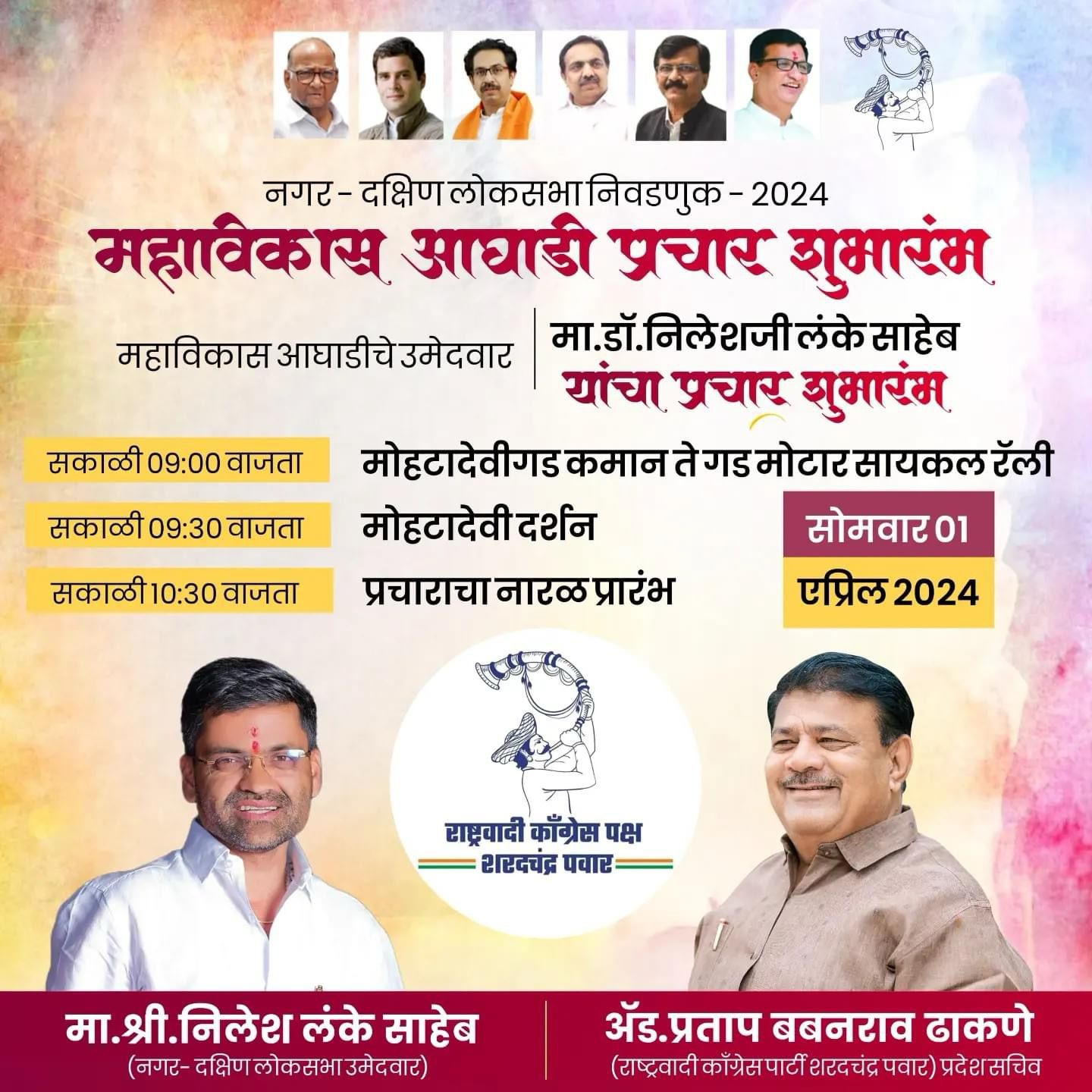 नगर लोकसभा मतदारसंघासाठी पारनेर चे आमदार निलेश लंके यांची महाविकास आघाडीकडून उमेदवारी निश्चित झाल्यानंतर त्यांचे सर्वत्र स्वागत करण्यात येत आहे. तसेच निलेश लंके यांनी महाविकास आघाडीतील नेत्यांच्या भेटीगाठी सुरू केल्या आहेत. याआधी निलेश लंके यांच्या पत्नी राणी लंके यांनी नगर दक्षिण लोकसभा मतदारसंघांमध्ये जनसंवाद यात्रा काढली होती. त्यानंतर आता निलेश लंके हे आज सोमवारपासून स्वाभिमान जनसंवाद यात्रा सुरू करत आहेत. मोहटादेवी गडापासून या यात्रेला सुरुवात होणार आहे.