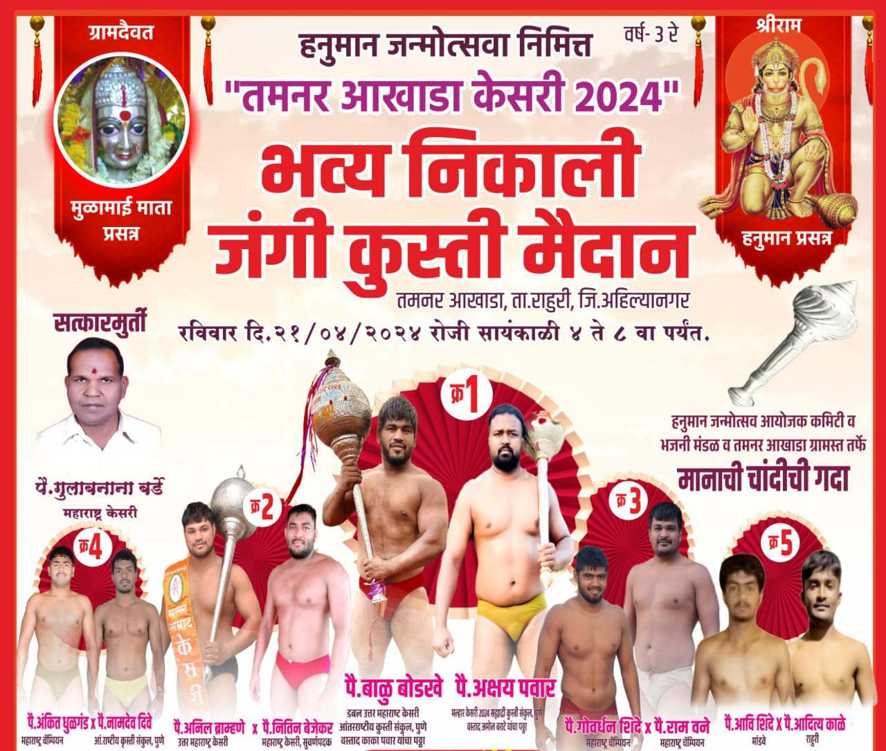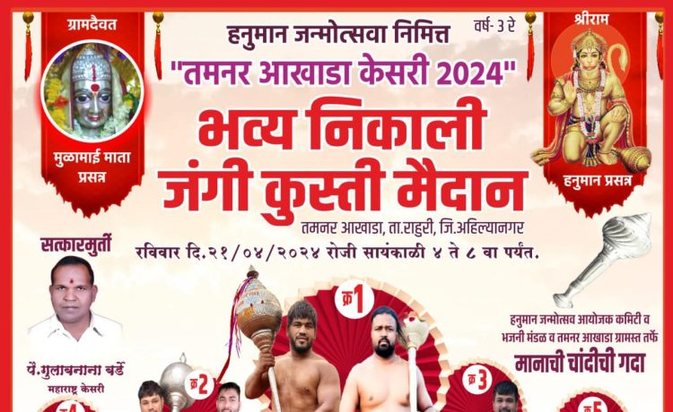 तमनर आखाडा येथे हनुमान जन्मोत्सवानिमित्त भव्य निकाली कुस्ती मैदानाचे आयोजन, देवनदी येथील लाल मातीवर रंगणार तमनर आखाडा केसरी २०२४ ची लढत